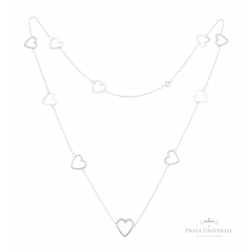 Colar Coração vazado de 70 cm, medindo cada coração 1.4 cm x 1.4 cm em prata.