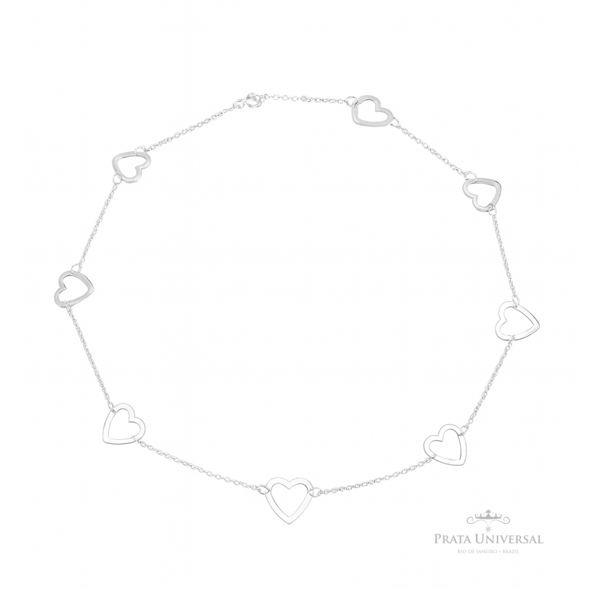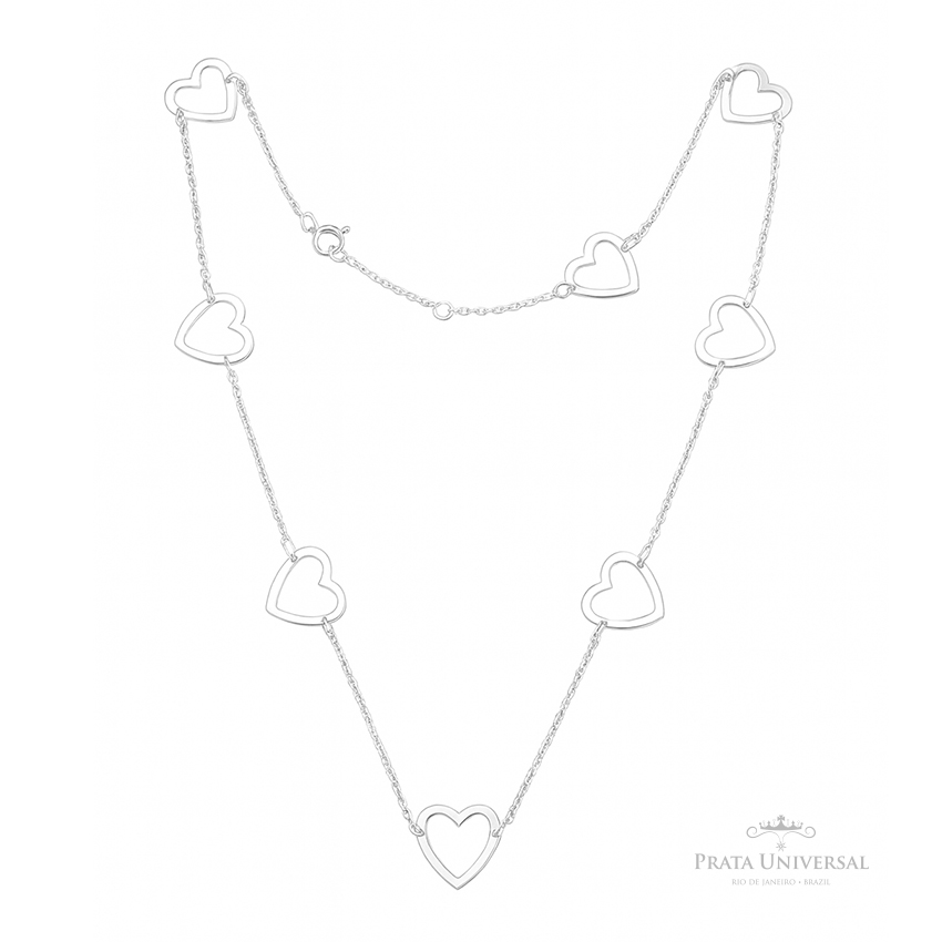 Colar Coração vazado G, medindo cada coração 1.3 cm x 1.3 cm, totalizando 45 cm de cordão em prata.