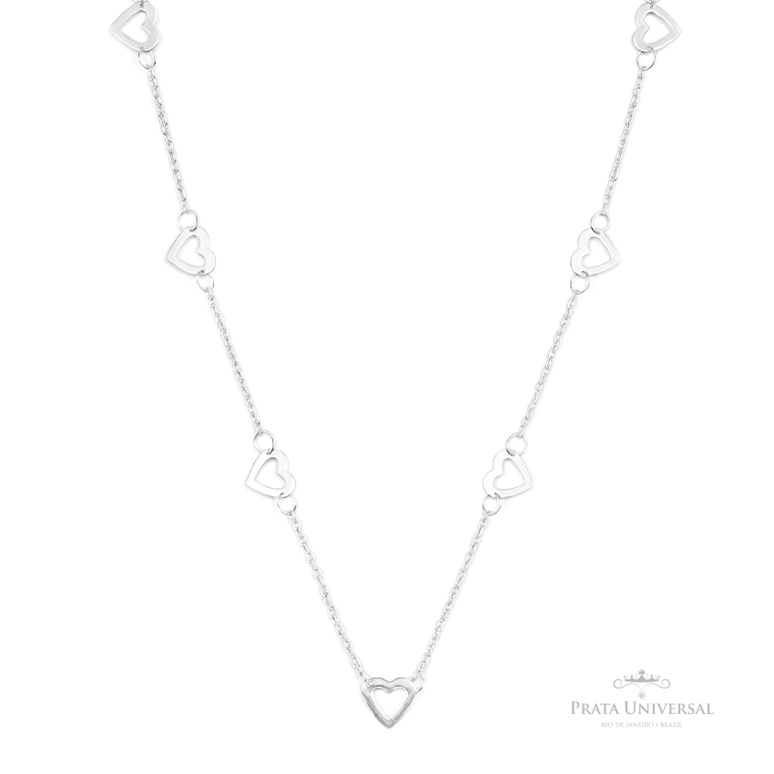 Colar Coração vazado de 45 cm, medindo cada coração 1.0 cm x 1.0 cm em prata.